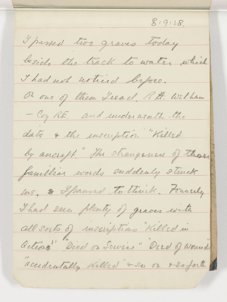 On one of them I read R.H. Welham – Coy RE. and underneath the date & the inscription "Killed by aircraft." The strangeness of those familiar words suddenly struck me. I paused to think. Formerly I had seen plenty of graves with all sorts of inscriptions "Killed in Action" "Died on Service" "Died of Wounds" "accidentally Killed" & so on & so forth
