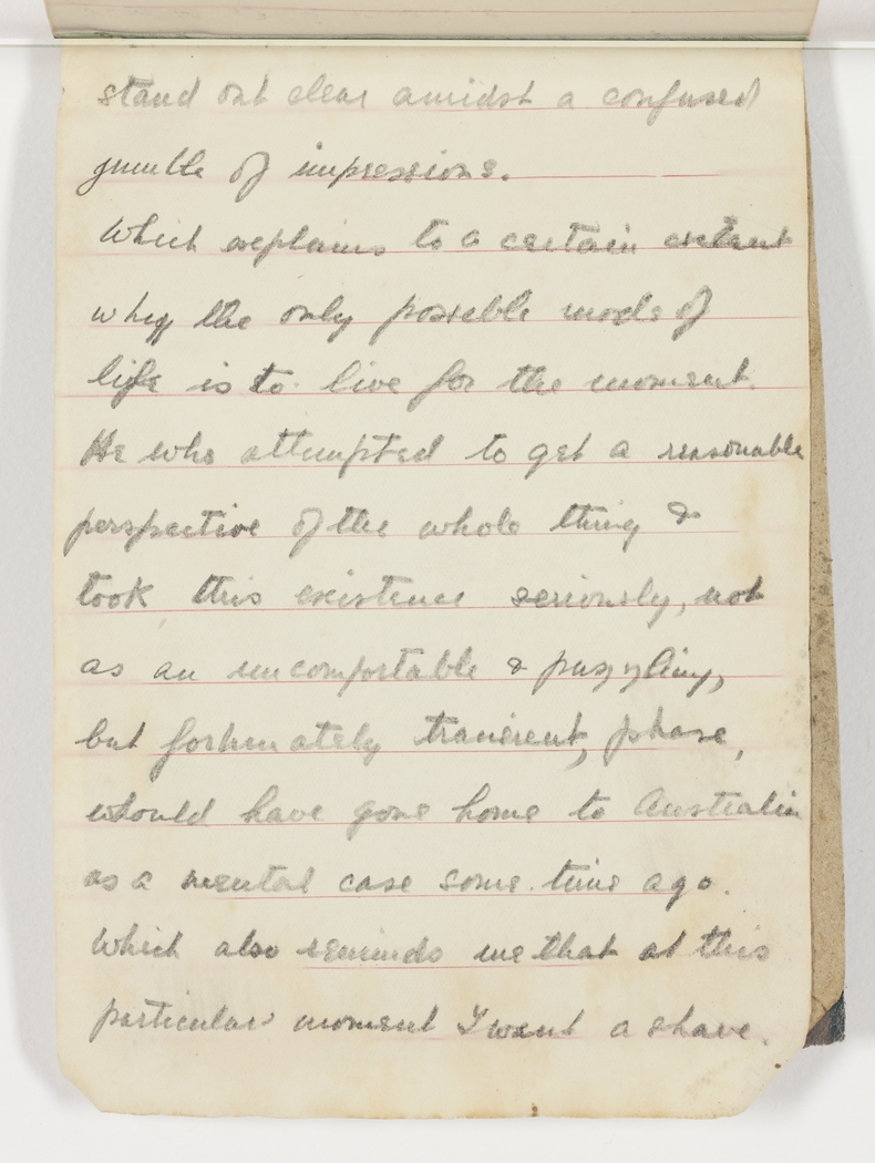Which explains to a certain extent why the only possible mode of life is to live for the moment. He who attempted to get a reasonable perspective of the whole thing & took this existence seriously, not as an uncomfortable & puzzling, but fortunately transient, phase would have gone home to Australia as a mental case some time ago. Which also reminds me at this particular moment I want a shave.