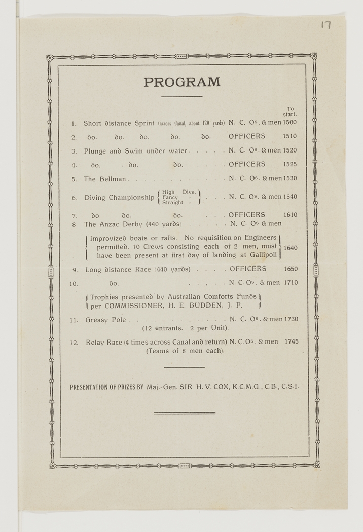 1. Short Distance Sprint (across canal, about 120 yards) N. C. Os. & men 1500