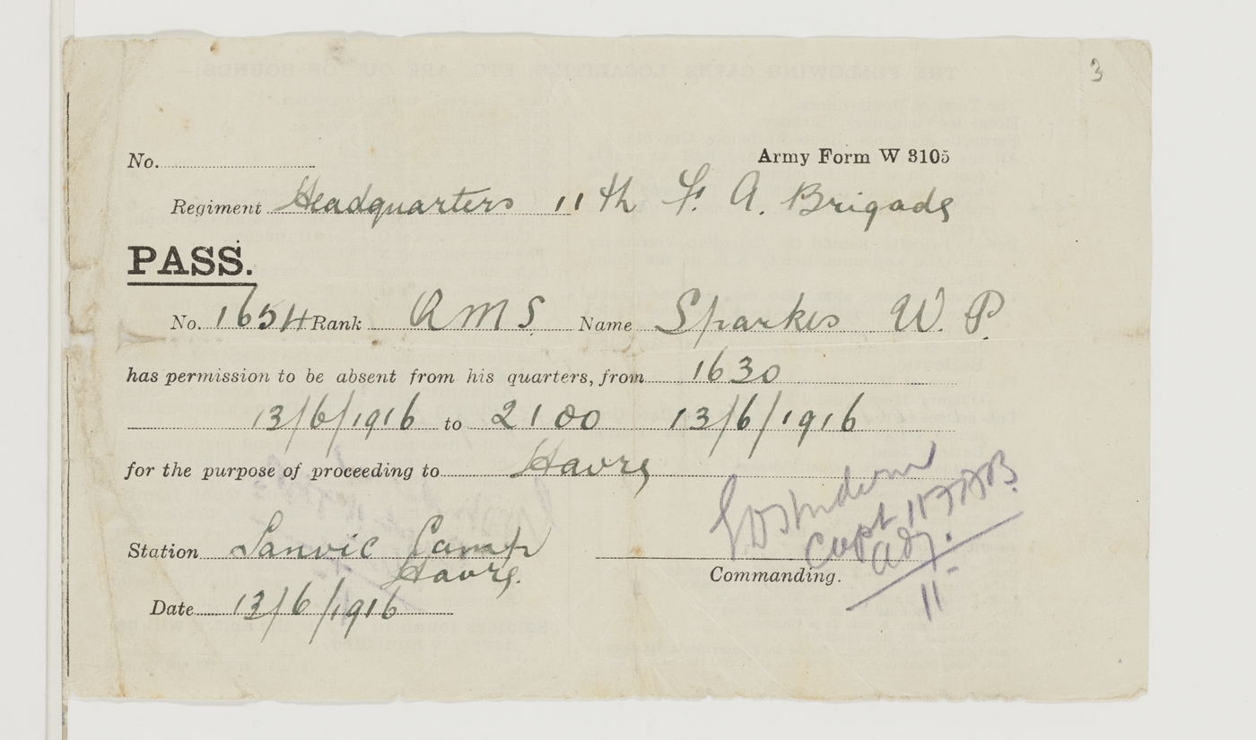 No 1654 - Rank QMS - Name Sparkes WP has permission to be absent from his quarters from 1630 13/6/1916 to 2100 13/6/1916 for the purpose of proceeding to Havre.