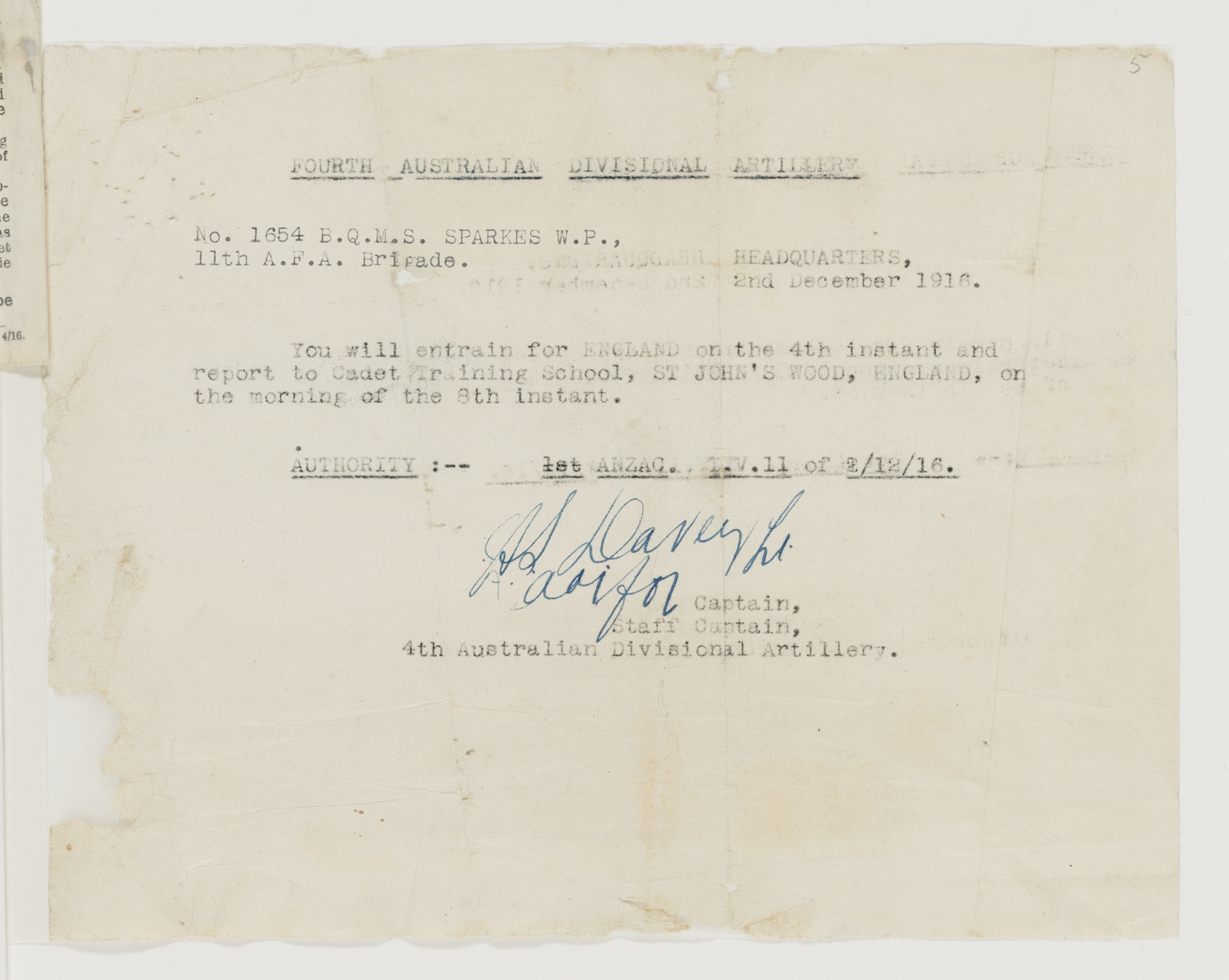 You will entrain for ENGLAND on the 4th instant and report to Cadet Training School, ST JOHN'S WOOD, ENGLAND, on the morning of the 8th instant.
