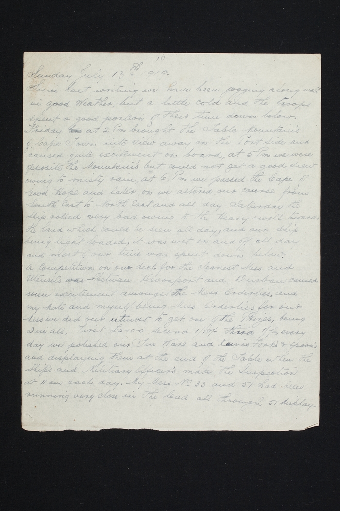 Since last writing we have been jogging along well in good Weather, but a little cold and the troops spent a good portion of their time down below. Friday bri at 2 Pm brought the Table Mountain's of Cape Town into view away on the Port Side and caused great excitement on board, at 5 Pm we were opposite the Mountain's but could not get a good view owing to misty rain, at 6 Pm we passed the Cape of Good Hope and later on we altered our course from South East to North East and all day Saturday the Ship rolled very bad owing to the Heavy swell towards the land which could be seen all day, and our Ship being light loaded, it was wet on and off all day and most of our time was spent down below. A Competition on our deck for the cleanest Mess and Utensils was h between Devonport and Durban caused some excitement amongst the Mess Orderlies, and my Mate and myself being Mess Orderlies for our Mess we did our utmost to get one of the Prizes, being 3 in all, First £2-10-/0 Second 1/10/- Third 1/-/-, every day we polished our Tin Ware and knives Forks & Spoons and displaying them at the end of the Table where the Ship's and Military Officer's make the Inspection at 11 am each day. My Mess No 33 and 51 had been running very close in the lead all through, 51 display-