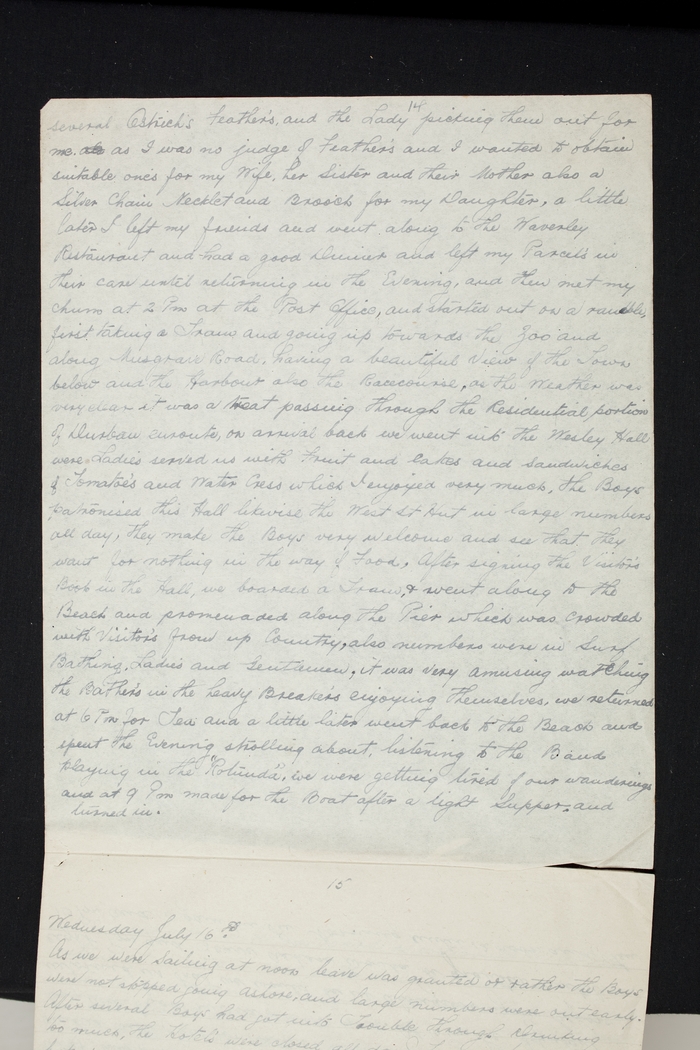 several Ostrich's feathers and the Lady picking them out for me als as I was no judge of Feather's and I wanted to obtain suitable one's for my Wife, her Sister and their Mother also a Silver Chain Necklet and Broach for my Daughter, a little later I left my friends and went along to the Waverley Restaurant and had a good Dinner and left my Parcels in their care until returning in the Evening, and then met my chum at 2 Pm at the Post Office, and started out on a ramble, first taking a Tram and going up towards the Zoo and along Musgrave Road, having a beautiful View of the Town below and the harbour also the Racecourse, as the Weather was very clear it was a treat passing through the Residential portions of Durban enroute, on arrival back we went into the Wesley Hall were Ladies served us with Fruit and cakes and sandwiches of Tomatoe's and Water Cress which I enjoyed very much, the Boys patronised this Hall likewise the West St Hut in large numbers all day, they make the Boys very welcome and see that they want for nothing in the way of Food. After signing the Visitor's Book in the Hall, we boarded a Tram, & went along to the Beach and promenaded along the Pier which was crowded with Visitor's from up Country, also numbers were in Surf Bathing. Ladies and Gentlemen, it was very amusing watching the Bather's in the heavy Breaker's enjoying themselves, we returned at 6 Pm for Tea and a little later went back to the Beach and spent the Evening strolling about, listening to the Band playing in the "Rotunda". We were getting tired of our wanderings and at 9 Pm made for the Boat after a light Supper and turned in.