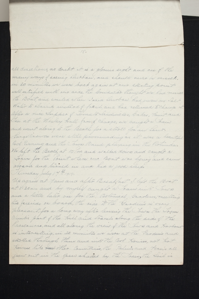 Up again at 7 am and after Breakfast I left the Boat at 8.30 am and by myself caught a Tram into Town and a little later one for the Botanical Gardens, meeting two friends on board, the ride to the garden's is very pleasant, for a long way after leaving the Town the Tram climbs part of the Hill and travels along the side of the Racecourse, and all along the view of the Town and Harbour is interesting, in 20 minutes we were at the Garden's and strolled through them and into the Cool Houses, not Hot Houses like oat other Countries, the Palm's and Fern's all grow out in the open shaded by the Trees, the Soil is