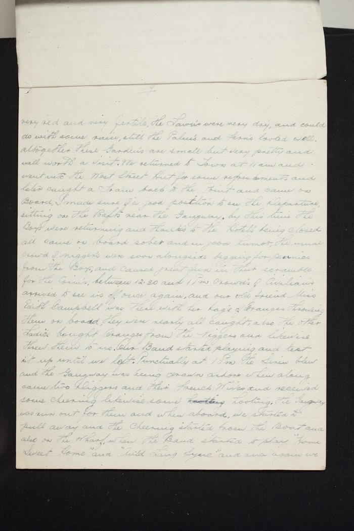 very red and very fertile, the Lawn's were very dry, and could do with some rain, still the Palm's and Fern's looked well. Altogether these Gardens are small but very pretty and well worth a visit. We returned to Town at 11 am and went into the West Street Hut for some refreshments and later caught a Tram back to the Point and came on Board. I made sure of a good position to see the Departure, sitting on the Raft's near the Gangway, by this time the Boys were returning and thank's to the Hotel's being closed all came on board sober and in good humor, the usual crowd of nigger's were soon alongside begging for pennies from the Boys, and caused great fun in their scramble for the Coin's, between 12.30 and 1 Pm crowd's of Civilian's arrived to see us off once again, and our old friend Miss Edith Campbell was there with her bag's of Oranges throwing them on board, they were nearly all caught, also the other Ladies bought Oranges from the Niggers and likewise threw them to us. Our Band started playing and kept it up until we left. Punctually at 1 Pm the Siren blew and the Gangway was being drawn ashore when along came two Diggers and their French Wives and received some cheering likewise some hootting hooting, the Gangway was soon out for them and when aboard, we started to pull away and the Cheering started from the Boat and also on the Wharf, where the Band started to play "Home Sweet Home" and "Auld Land Syne" and once again we