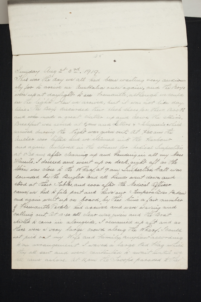 This was the day we all had been waiting very anxiously for to arrive in Australia once again, and the Boys were up at daylight to see Fremantle, although we could see the lights when we arrived, but it was not like daytime. The Boys discarded their Deck Shoes for their Boots and whe made a great clatter up and down the stairs. Breakfast was served at 6, am and Letters & Telegram's which arrived during the Night was given out. At 7.30 am the Anchor was lifted and we steamed into the Harbour and again Anchored in the stream for Medical Inspection at 8.30 am after cleaning up and handing in all my Mess Utensil's, I dressed and went up on deck, right aft as the Stern was close to the Wharf, at 9 am Inspection Call was sounded by the Bugler and all hands went down and stood at their Tables, and soon after the Medical Officer came, we had to file past and have our Temperatures taken and again went up on board, by this time a fair number of Fremantle People had arrived and were waving and calling out. At 10.30 all clear was given and the Boat started to come in alongside. I remained up aft and as there were a very large crowd along the Wharf, I could not pick out my Wife and Family, anyhow according to an arrangement I waved a large Red Flag which they all saw and were contented to await until we all came ashore. At 11, am the Troops paraded to the