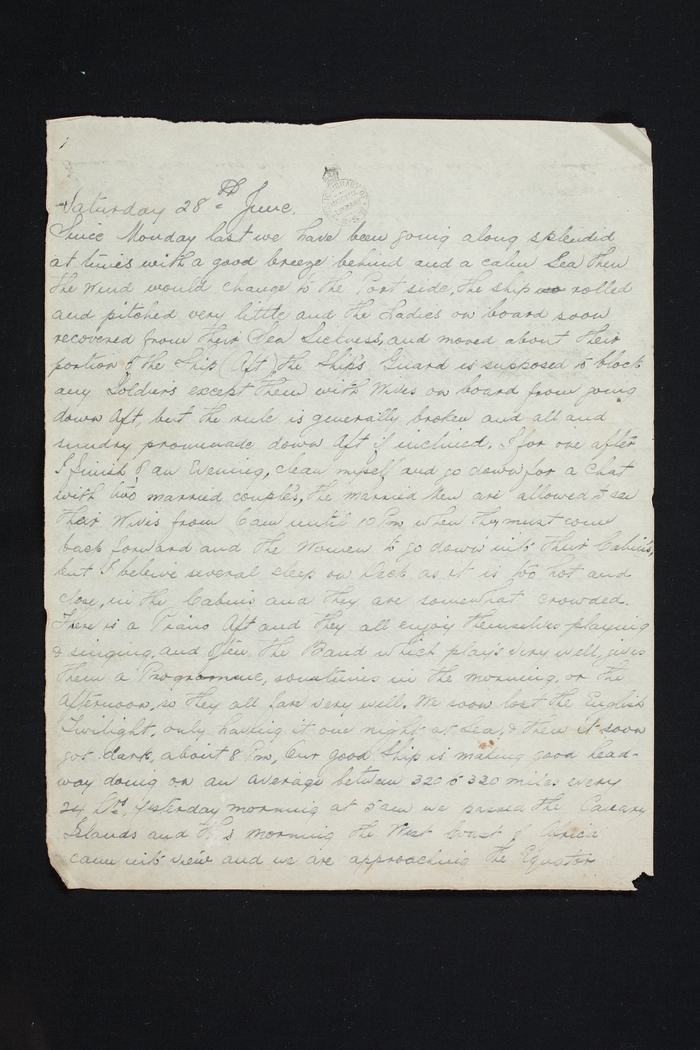 Since Monday last we have been going along splendid at times with a good breeze behind and a calm Sea then the Wind would change to the Port side, the ship wo rolled and pitched very little and the Ladies on board soon recovered from their Sea Sickness, and moved about their portion of the Ship (Aft). The Ship's Guard is supposed to block any soldiers except them with Wives on board from going down Aft, but the rule is generally broken and all and sundry promenade down Aft if inclined, I for one after I finish of an Evening, clean myself and go down for a chat with two married couples, the married Men are allowed to see their Wives from 6 am until 10 Pm when they must come back forward and the Women to go down into their Cabins, but I believe several sleep on Deck as it is too hot and close, in the Cabins and they are somewhat crowded. There is a Piano Aft and they all enjoy themselves playing & singing, and often the Band which play's very well, gives them a Programme, sometimes in the morning, or the Afternoon, so they all fare very well. We soon lost the English Twilight, only having it one night at Sea & then it soon got dark, about 8 Pm, Our Good Ship is making good headway doing on an average between 320 to 330 miles every 24 hrs. Yesterday morning at 5 am we passed the Canary Islands and this morning the West Coast of Africa came into view and we are approaching the Equator