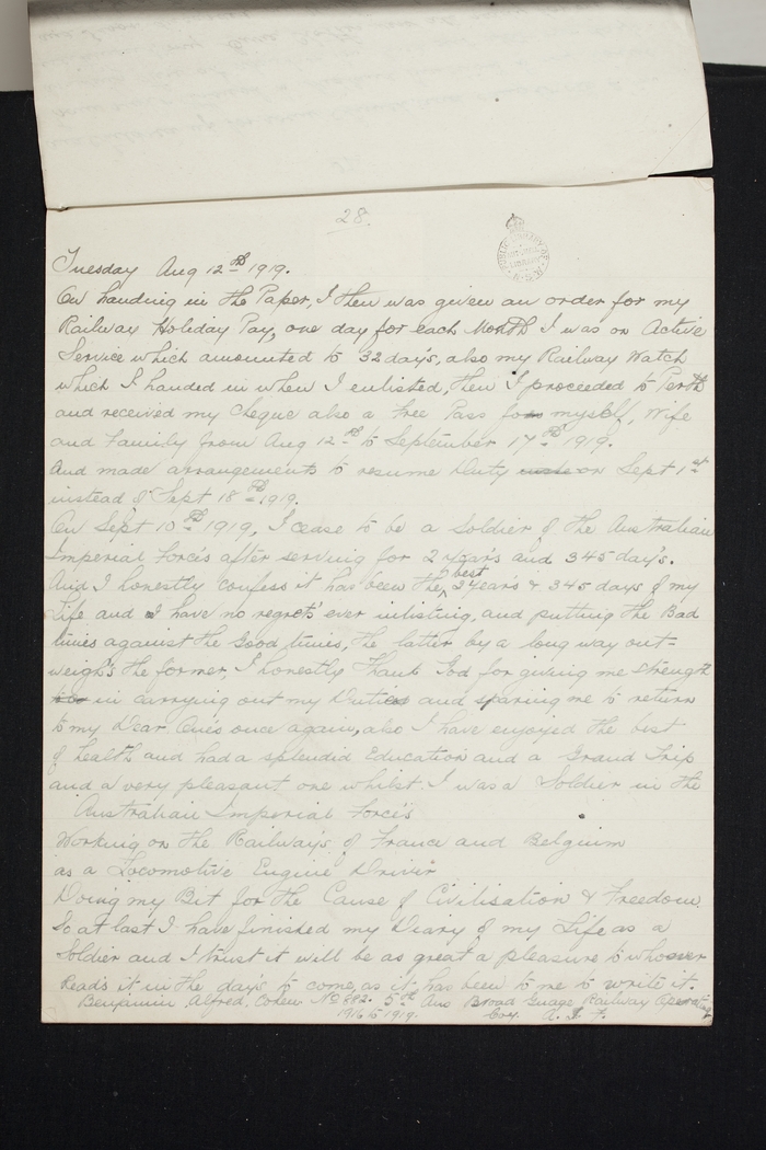 On Sept 10th 1919, I cease to be a Soldier of the Australian Imperial Force's after serving for 2 Year's and 345 day's. And I honestly confess it has been the best 2 year's and 345 days of my Life and I have no regret's over inlisting, and putting the Bad times against the Good Times, the latter by a long way outweigh's the former, I honestly Thank God for giving me strength to be in carrying out my Duties and sparing me to return to my Dear One's once again, also I have enjoyed the best of health and had a splendid Education and a Grand Trip and a very pleasant one whilst I was a Soldier in the Australian Imperial Force's