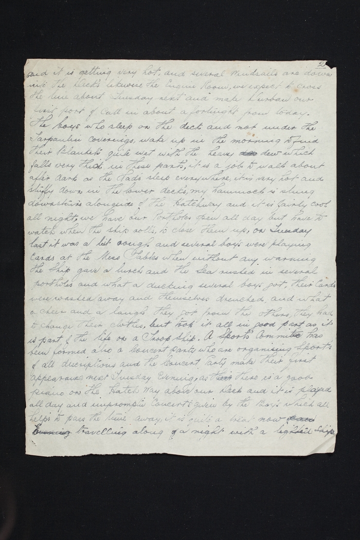 and it is getting very hot, and several Windsails are down into the Deck's likewise The Engine Room, we expect to cross the line about Tuesday next and make Durban our first port of Call in about a fortnight from today. The boys who sleep on the deck and not under the Tarpaulin coverings, wake up in the morning to find their blankets quite wet with the heavy due dew which falls very thick in these parts, it is a job to walk about after dark as the Lads sleep everywhere, it is very hot and stuffy down in the lower deck's, my hammock is slung downstairs alongside of the Hatchway and it is fairly cool all night, we have our Portholes open all day but have to watch when the ship rolls, to close them up, on Tuesday last it was a bit rough and several boys were playing Cards at the Mess Tables when without any warning the Ship gave a lurch and the Sea rushed in several portholes and what a ducking several boys got, their Cards were washed away and themselves drenched, and what a cheer and a laugh they got from the others, they had to change their clothes, but took it all in good part, as it is part of the life on a Troop Ship. A Sport's Commitee has been formed, also a Concert party who are organising Sports of all descriptions and the Concert Party make their first appearance next Tuesday Evening, as their there is a good piano on the Hatch above our Deck and it is played all day and impromptu Concerts given by the Boys which all helps to pass the time away, it is quite a treat now have Evening travelling along of a night with lighted Ship