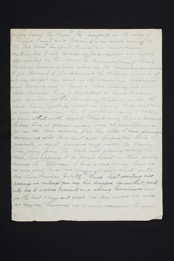 away from the Sun. The Comforts in the way of Tinned Fruit and Biscuits also Sox's issued by the "Red Cross Comforts Fund" are now being distributed to all hands on board, and are highly appreciated by the Boys. The Conservation of Fresh Water on board is very strict as the Commander wishes to get through to Durban, and the Water is turned off all day except an hour in the morning, Afternoon, and Evening and I being a Mess Orderly for our Table, I always have a Bucketful on hand to wash after cleaning up. The Drinking Water is on for the same time. Upstairs, Sports are being held but are so crowded and one has to get there early to obtain a view, what with, Sports, Trial's, and Band Concerts the boys time is passed away very pleasant, and as for me, the time actually fly's by. After I have finished cleaning up after Breakfast and Inspection time I generally go right forward and watch the Flying Fish going from the bow's and gliding along the Water, there appears to be plenty about in these parts, during the Afternoon I have a nap for an hour or so, and play Cards and Draughts after Dark until Bed time. Sunday July 6 y th Since last writing our average in mileage per day has dropped somewhat, partially due to adverse Currents and strong headwinds and for the last 3 days our speed has been under 300 miles per day, on Thursday we passed Ascension Island