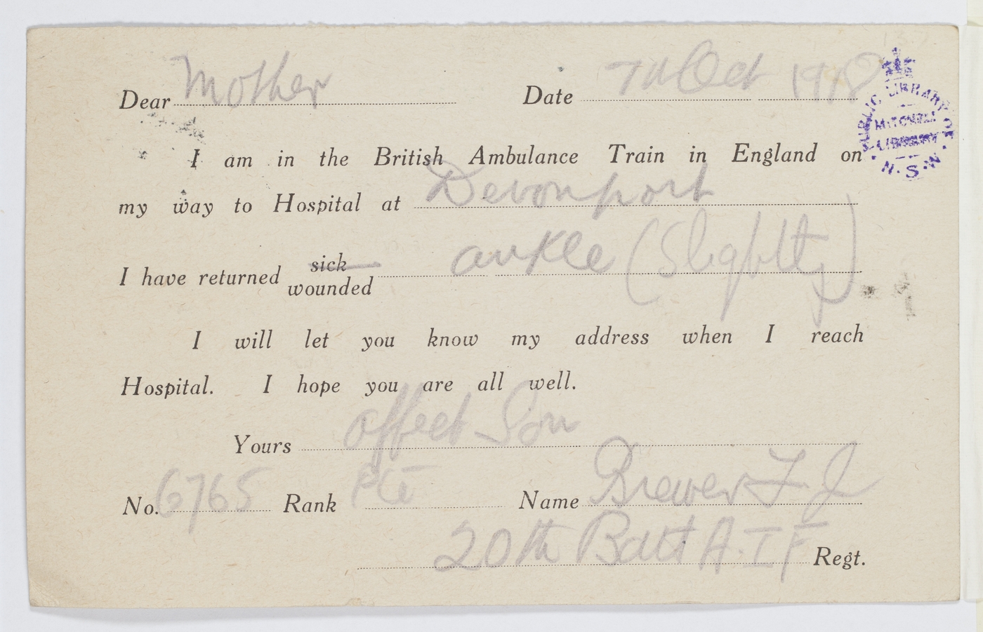 I will let you know my address when I reach Hospital. I hope you are all well.