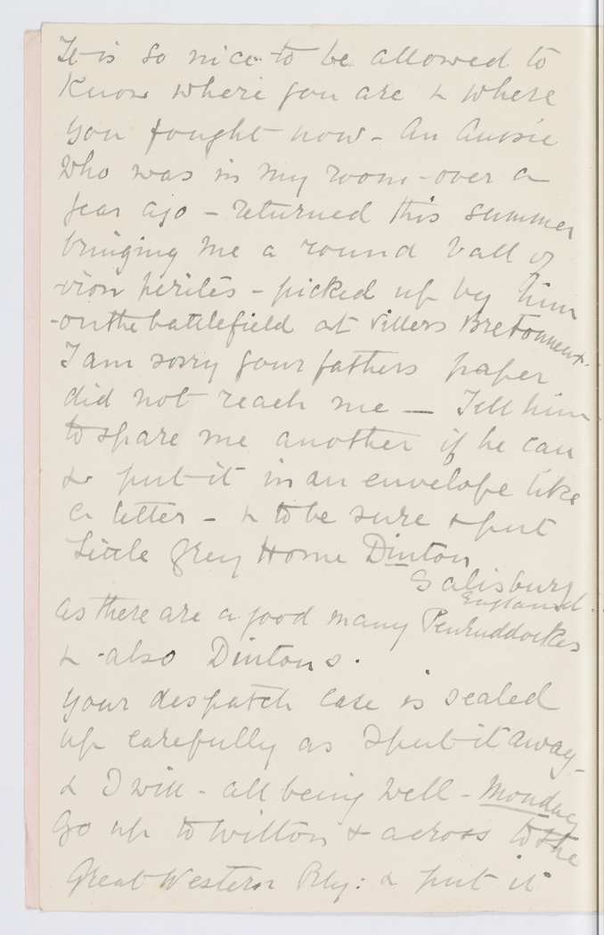It is so nice to be allowed to know where you are & where you fought now - An Aussie who was in my room - over a year ago - returned this summer bringing me a round ball of iron perites - picked up by him - on the battlefield at Villers Bretonneux.