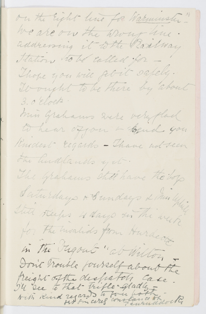 The Grahams still have the boys Saturdays & Sundays & Miss Uphill still keeps 4 days in the week for the invalids from Hurdcott in "the Dugout" at Wilton. Don't trouble yourself about the freight of the despatch case. I'll see to that trifle gladly -