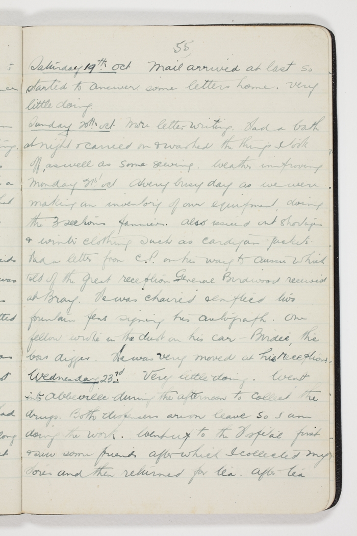 A very busy day as we were making an inventory of our equipment, doing the 3 sections panniers. Also issued out shortages & winter clothing such as cardigan jackets. Had a letter from C.P. on his way to Aussie which told of the great reception General Birdwood received at Bray. He was chaired and emptied two fountain pens signing his autograph. One fellow wrote in the dust of his car - Birdie, the boss digger. He was very moved at his reception.