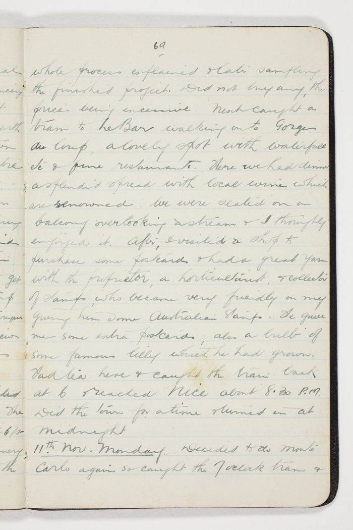 whole process explained & later sampling the finished project. Did not buy any, the prices being excessive. Next caught a tram to Le Bar walking on to Gorge du loup, a lovely spot with waterfall etc & fine restaurants. There we had dinner a splendid spread with local wines which are renowned. We were seated on a balcony overlooking a stream & I thoroughly enjoyed it. After, I visited a shop to purchase some postcards & had a great yarn with the proprietor, a horticulturist & collector of stamps, who became very friendly on my giving him some Australian stamps. He gave me some extra postcards, also a bulb of some famous lilly which he had grown. Had tea here & caught the train back at 6 and reached Nice about 8.30 P.M. Did the town for a time & turned in at midnight.