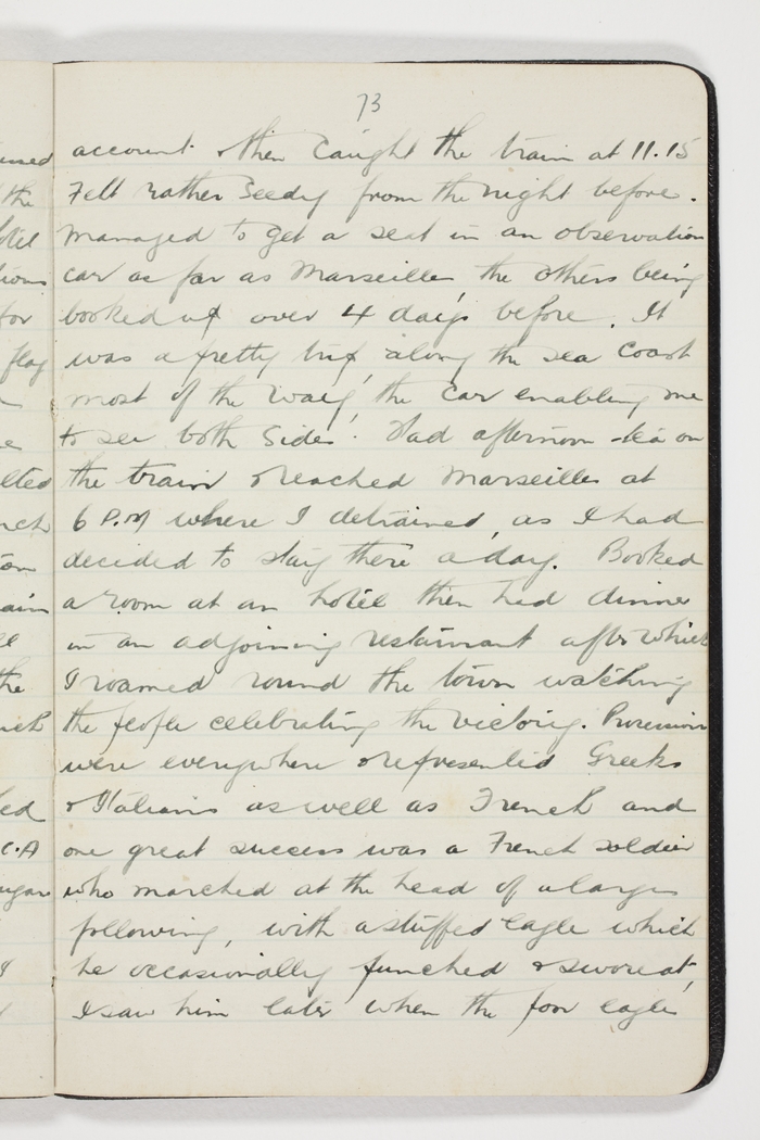 account & then caught the train at 11.15. Felt rather seedy from the night before. Managed to get a seat in an observation car as far as Marseilles, the others being booked up over 4 days before. It was a pretty trip along the sea coast most of the way, the car enabling me to see both sides. Had afternoon tea on the train & reached Marseilles at 6 P.M. where detrained, as I had decided to stay there a day. Booked a room at an hotel then had dinner in an adjoining restaurant after which I roamed round the town watching the people celebrating the victory. Processions were everywhere & represented Greeks & Italians as well as French and one great success was a French soldier who marched at the head of a large following, with a stuffed eagle which he occasionally punched & swore at, I saw him later when the poor eagle