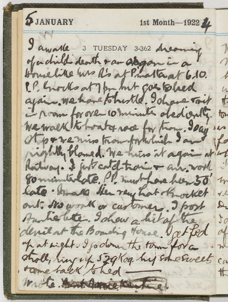 I awake dreaming of a child's death & an organ in a House like Mrs R's at P'matta at 6.10. P.P. knocks at 7 pm but goes to bed again. We have to hustle. I shave and sit in room for over 10 minutes obediently. We walk to boat & race for tram. I say stop and we miss tram for which I am rightly blamed. We miss it again at Railway. I just catch train & arr. work 80 minutes late. P.P. must have been 'S0' late. I make Her very hot & knocked out. No work or customers. I post Auntie's letter. I show a bit of the devil at the Boarding House. I get fed up at night. I go down the town for a stroll, ring up 529 Kog. buy some sweets and come back to bed.