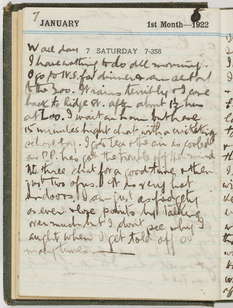 I have nothing to do all morning. I go to I.V.S. for dinner and am sent out to the Zoo. It rains terribly & I come back to Ridge St. after about 1½ hrs at Zoo. I wait an hour but have 15 minutes bright chat with a cricketing school boy. I go to tea & the air is cooled as P.P. has got the trouble off Her mind. We three chat for a good time & then just two of us. It is very hot indoors. I am just as fidgety as ever and lose points by talking over much but I don't see why I aught when I get told off so many times.
