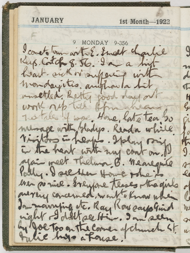 I come to town with E. I meet Charlie Keys. Catch 8.56. I am a bit heart-sick or suffering with Mondayitis, anyhow a bit unsettled. Pretty good day at work and up till 6pm. hear no tales of woe. Home, late tea. Go message with Gladys. Read a while. Visitors in heaps. I play & sing in the heat with my coat on. I again meet Thelma B. We are quite Pally. I see her Home & she is ever so nice. Everyone teases & the girls are very concerned, want to know when I am marrying etc. Ray Row says Goodnight & I didn't see Him. I am seen by Joe too on the corner of Church St. Julie buys a house.