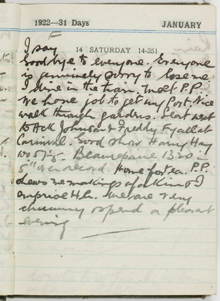 I say Goodbye to everyone. Everyone is genuinely sorry to lose me. I dine in the train. Meet P.P. We have job to get my Port. Nice walk through gardens. Seat next to Ack Johnson & Freddy Fyall at Carnival. Good show. Harry Hay 100 57½ Beaurepaire 1320 in 5" over record. Home for tea. P.P. shows me makings of a kind. I surprise her. We are very chummy & spend a pleasant evening.
