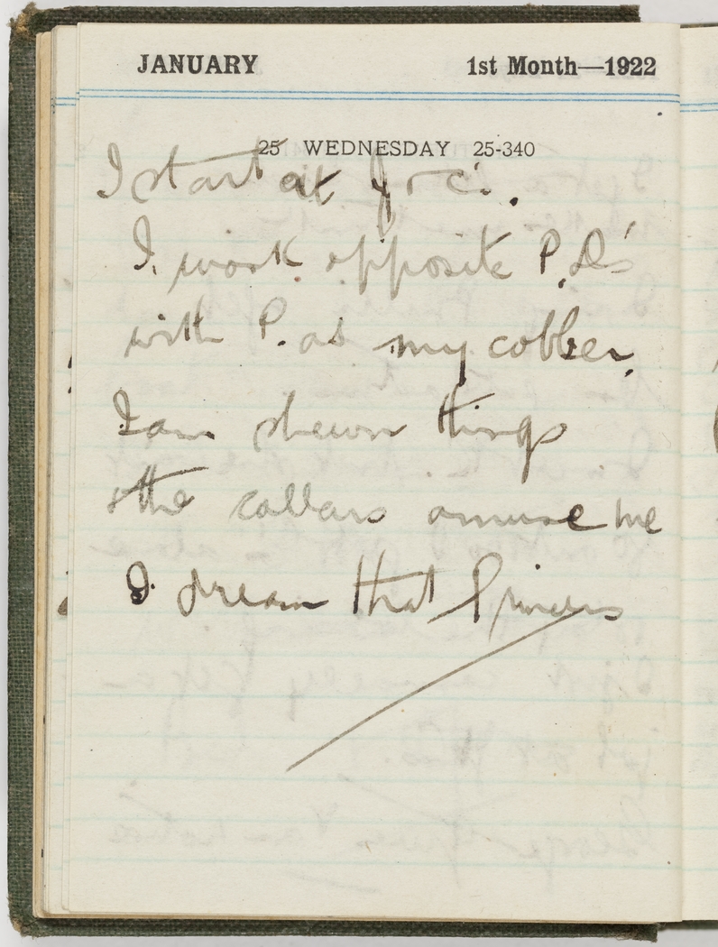 I start work at J&Cs. I work opposite P.D's with P. as my cobber. I am shown things and the collars amuse me. I dream that Princess.