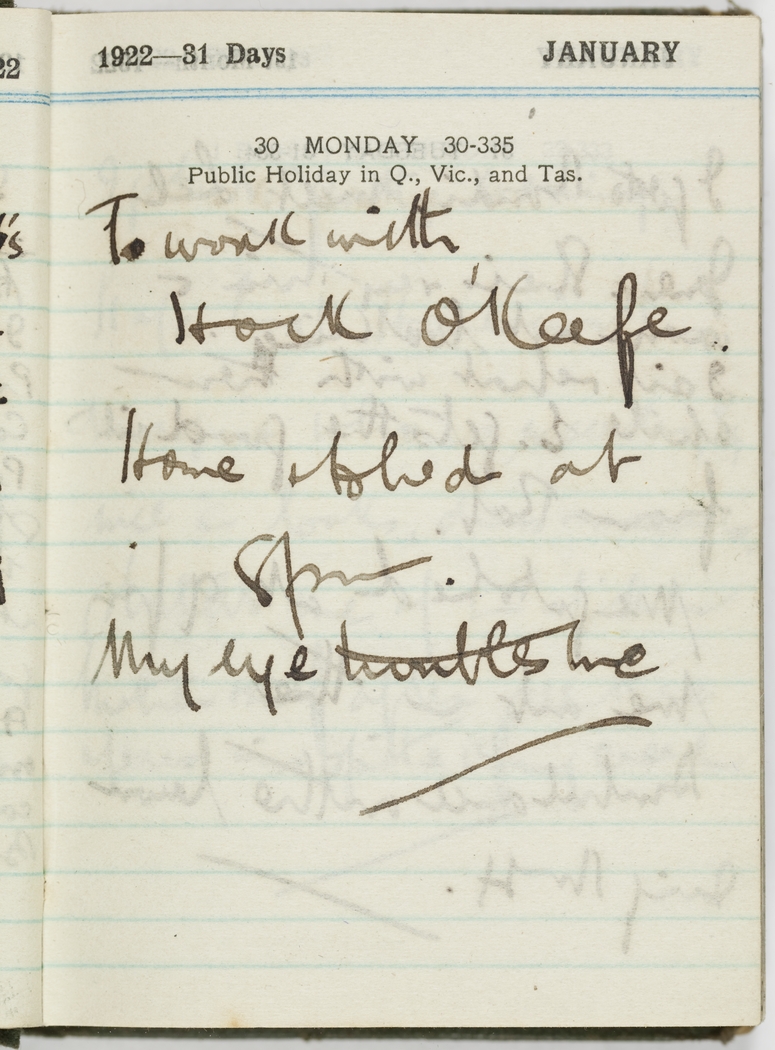 To work with Hock O'Keefe. Home and to bed at 8 p.m. My eye troubles me.