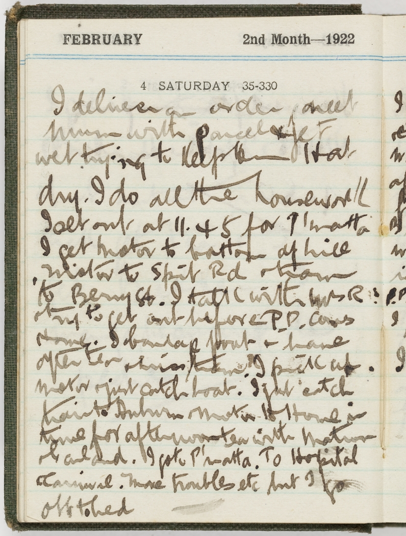 I deliver an order and meet mum with parcel and get wet trying to keep them both dry. I do all the housework. I set out at 11.45 for P'matta I get motor to bottom of hill, motor to Spit Rd and tram to Berry St. I talk with Mrs R. and try to get out before P.P. comes home. I bandage foot and leave after ten and miss them. I pick up motor and just catch boat. I just catch train to Durham and motor to Home in time for afternoon tea with matron and Garland. I go to P'matta. To hospital carnival. More troubles etc but I go off to bed.