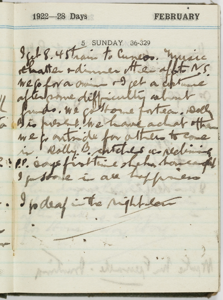 I get 8.45 train to Cuneos. Music and chatter and dinner. Then off to N.S. we go for a swim and get a costume after some difficulty about funds. We get home for tea. Dolly B. is present. We have a chat and then we go outside for others to come in. Dolly B catches us reclining. P.P. says first time she has houseful. I go home in all happiness.