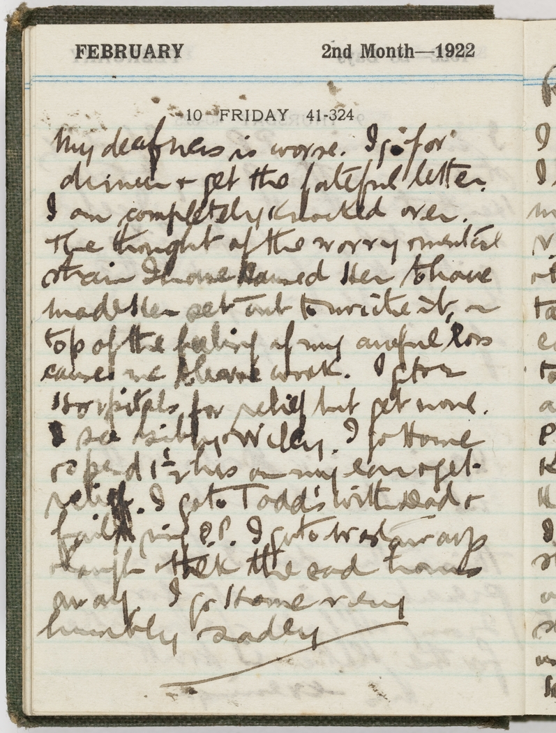 My deafness is worse. I go for dinner and get the fateful letter. I am completely knocked over. The thought of the worry and mental strain I have caused her to have made her set out to write it, on top of the feeling of my awful loss caused me to leave work. I go to the hospital for relief but get none. I see Gibly and Wiley. I go home and spend 1½ hours on my ear and get relief. I go to Todd's with Dad and fail to ring P.P. I go to Westerways and laugh and talk the sad times away. I go home very humbly and sadly. .