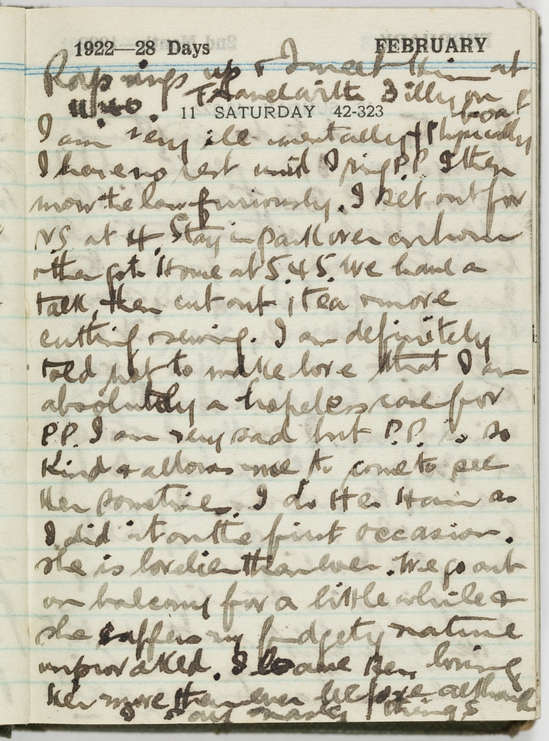 Rap rings up and I meet him at 11.40. Travel with Billy on boat. I am very ill mentally and physically, I have no rest until I ring P.P. I then mow the lawn furiously. I set out for N.S at 4. Stay in park an hour and then got home at 5.45. We have a talk, then cut until tea and more cutting and sewing. I am definitely told not to make love that I am absolutely a hopeless case for P.P. I am very sad but P.P. is so kind and allows me to come to see her sometimes. I do her hair as I did it on the first occasion. She is lovelier than ever. We go out on balcony for a little while and she suffers my fidgety nature unprovoked. I leave her loving her more than ever before although not nasty things.