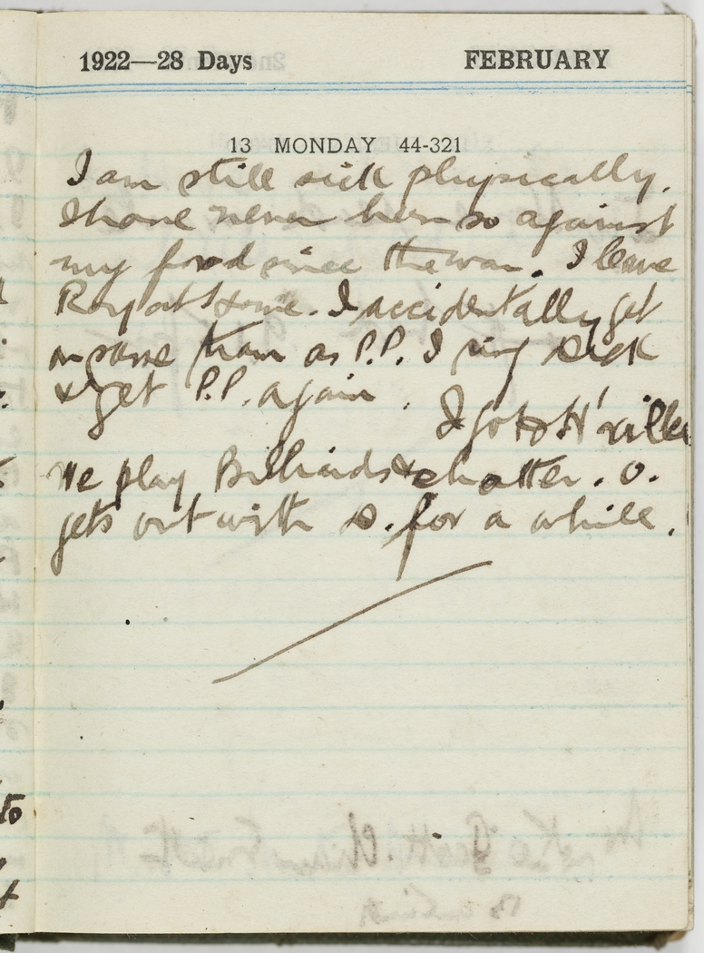 I am still sick physically. I have never been against my food since the war. I leave Roy at home. I accidentally get on same tram as P.P. I ring Dick and get P.P. again I go to H'ville, we play billiards and chatter. O. gets out with D. for a while.