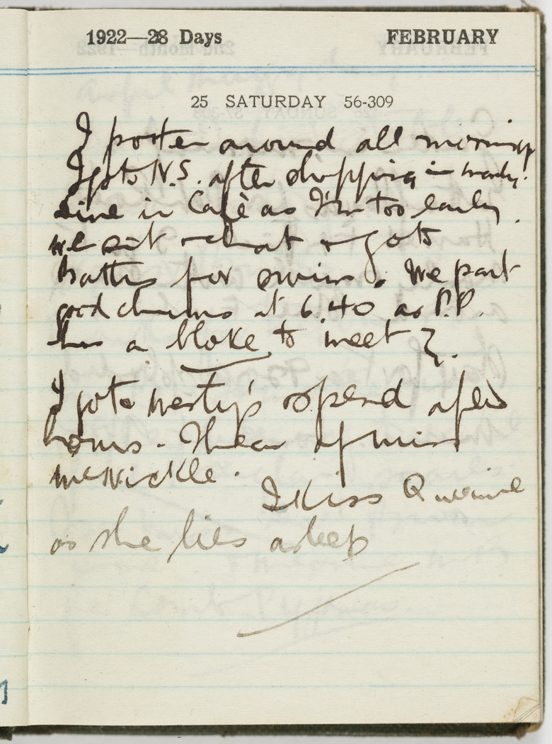 I potter around all morning. I go to N.S. after shopping in Manly. Dine in café as I'm too early. We sit & chat & go to baths for swim. We part good chums at 6.40 as P.P. has a bloke to meet? I go to Westy's to spend a few hours. I hear of Miss McNickle. I kiss Queenie as she lies asleep.