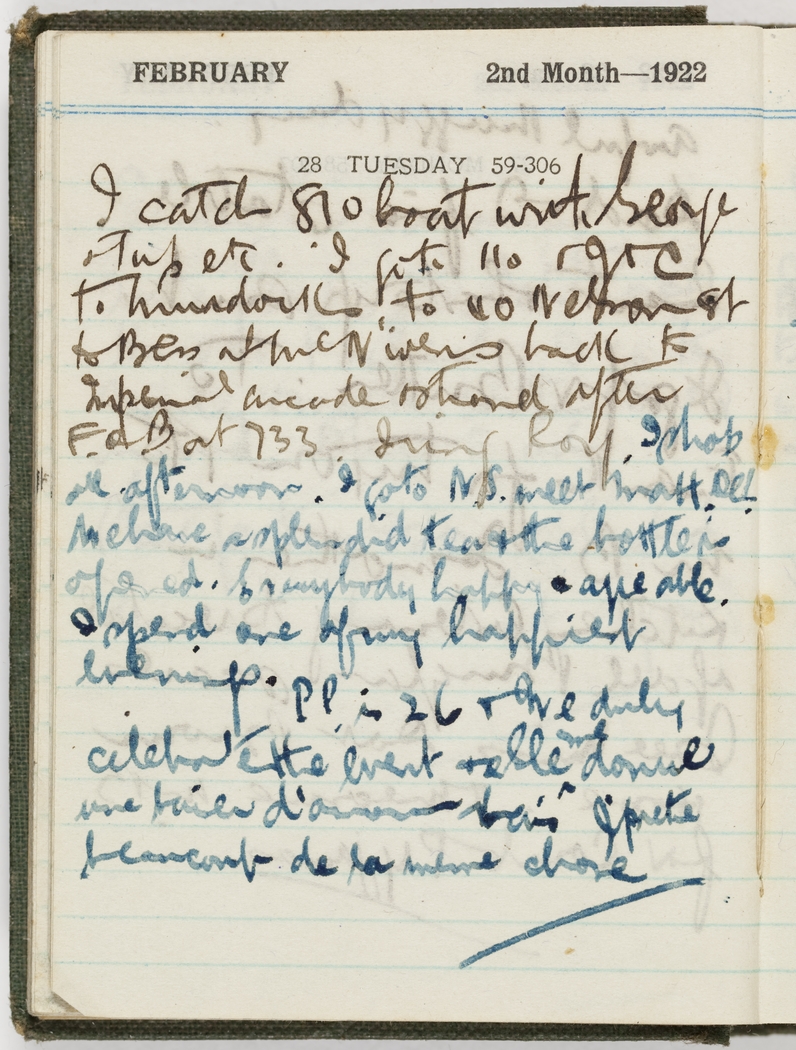 I catch 8.10 boat with George & Tups etc. I go to 110 & J & C, to Murdocks, to 40 Nelson Street, to Bess & McNiven's, back to Imperial Arcade & Strand after F. & B. at 733. I ring Roy. I shop all afternoon. I go to N.S. meet Matt. DCL. We have a splendid tea & the bottler's opened. Everybody happy and agreeable. I spend one of my happiest evenings.