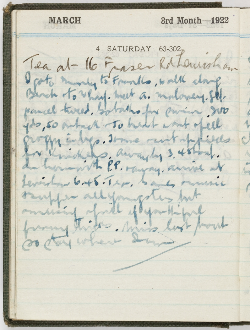 Tea at 16 Fraser Rd  Lewisham. I go to Manly to Franks, walk along beach to wharf. Meet A. Maloney, get parcel tweed. Go to baths for swim, 200yds, 50 on back & so head out & feel groggy in legs. Home & cut up frills for knickers. Away by 3.45 boat, an hour with P.P. and away, arrive at Lewisham 6.45. Tea.games and music & supper all youngsters but amusing & fine if youthful funny tricks, miss last boat so stay where I can.