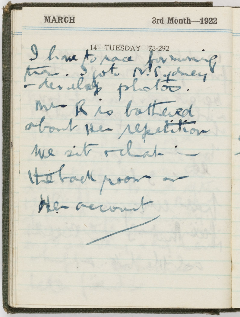I have to race for morning tram. I go to N.Sydney and develop photos. Mrs R is bothered about her reputation. We sit and chat in the back room on her account.