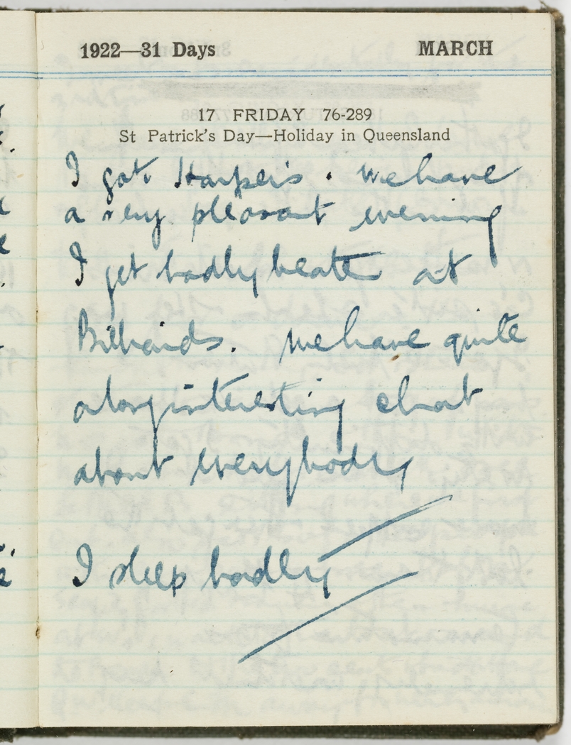 I go to Harper's. We have a very pleasant evening, I get badly beaten at Billiards. We have quite a long interesting chat about everybody. I sleep badly.
