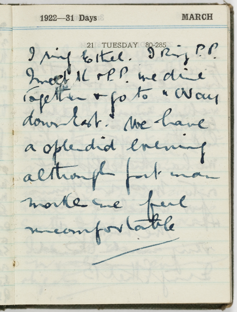 I ring Ethel. I ring P.P. I meet K & P.P., we dine together & go to "Way down East". We have a splendid evening although fat man makes me feel uncomfortable.