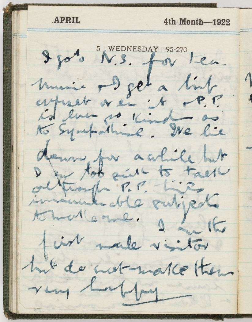 I go to N.S. for tea, music and I get a bit upset over it & P.P. is ever so kind as to sympathise. I lie down for a while but I am too sick to talk although P.P. tries innumerable subjects to make me. I am the first male visitor but do not make them very happy.