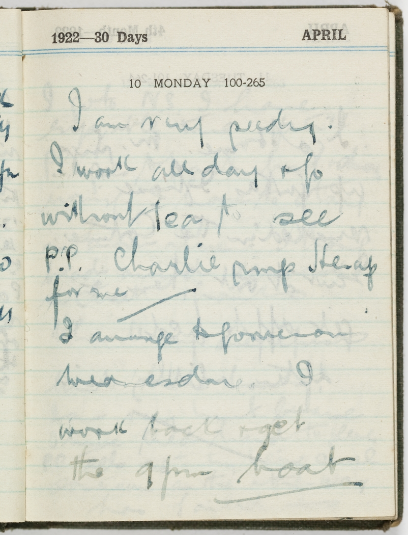 I am very seedy. I work all day and go without tea to see P.P. Charlie rings her up for me. I arrange to go over on Wednesday. I work back and get the 9 pm boat.