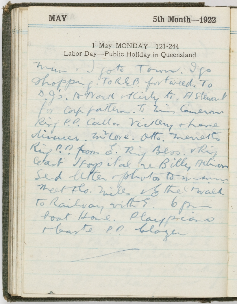 Mum and I go to town. I go shopping. To R & B for tweed. To D.J's to Nock & Kirby to A Stewart for cap patterns. To Miss Cameron. Ring P.P. Call on Vickery and have dinner, Mr Love, Otto, Merrrets. Ring P.P. from E. Ring Bess & Ring Coast Hosp. re Billy Albion. Send letter & photo to M.M.M. Meet Flo. Mills & Ethel and walk to Railway with E. 6 pm boat home. Play piano and baste P.P. blazer.