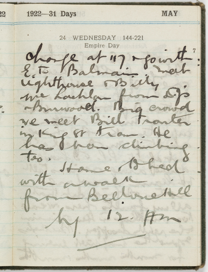 Change at 117 and go with E. to Balmain. Meet Lighthouse and Billy, McLachlan from D.J's and Burwood. Big crowd. We meet Bill Tranter in King St tram. He has been climbing too. Home and to bed with a walk from Bellvue Hill by12 am.