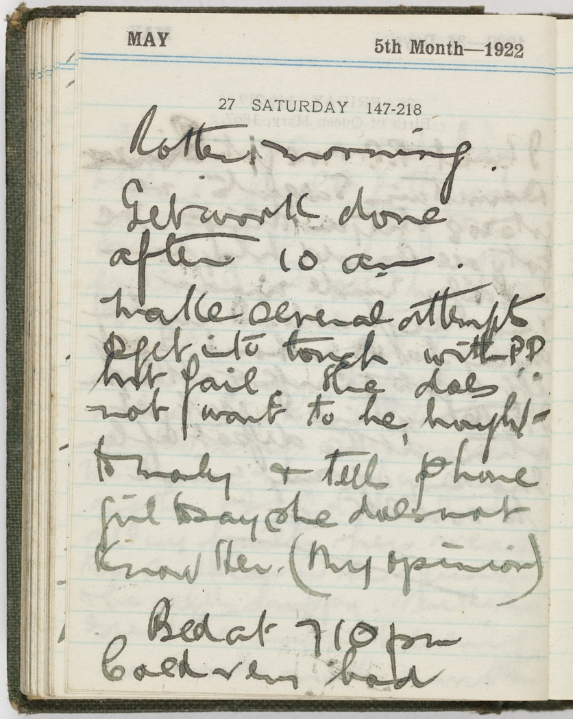 Rotten morning. Get work done after 10 am. Make several attempts to get into touch with P.P. but fail. She does not want to be brought to Manly and tells phone girl to say she does not know her. (My opinion.) Bed at 7.10 pm. Cold very bad.