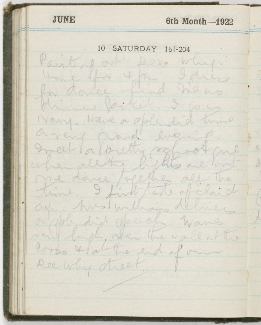 Painting at Dee Why. Home for 4 pm. I dress for dance and find I've no dinner jacket. I go in Navy. Have a splendid time a very grand evening. I meet a pretty school girl when all the lights are out and we dance together all the time. I first taste of claret cup. Mrs Williams delivers a splendid speech. Waves very high over the wall at the Corso and at the end of our Dee Why street.
