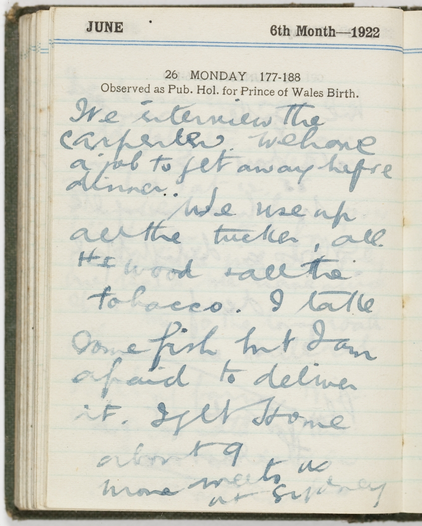 We interview the carpenter. We have a job to get away before dinner. We use up all the tucker, all the wood and all the tobacco. I take some fish but I am afraid to deliver it. I get home about 9. Mona meets us at Sydney.