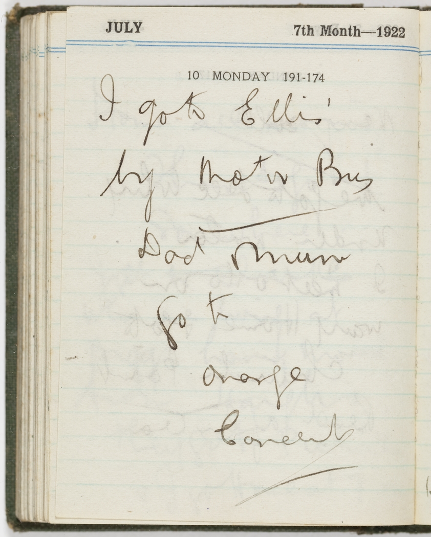 I go to Ellis' by motor Bus. Dad and Mum go to Orange Concert.