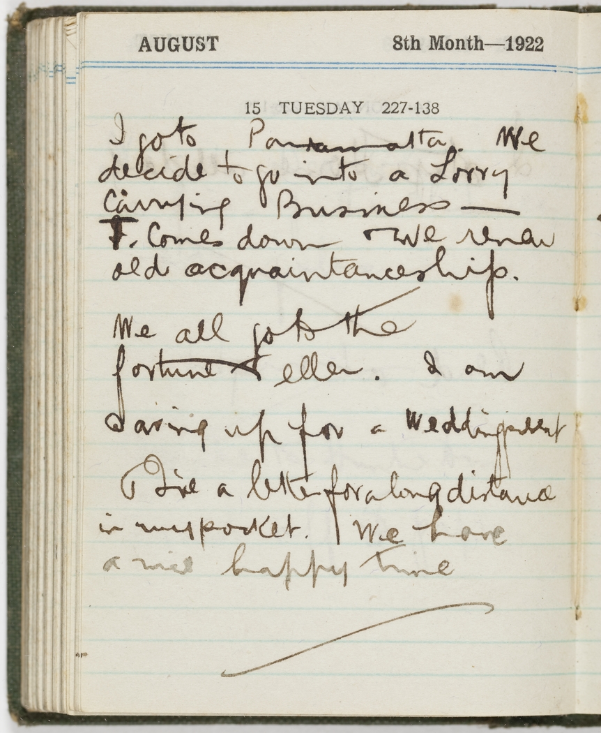I go to Parramatta. We decide to go into a Lorry Carrying Business. T. comes down and we renew old acquaintanceship. We all go to the fortune teller. I am saving up for a wedding present and I've a letter for a long distance in my pocket. We have a nice happy time.