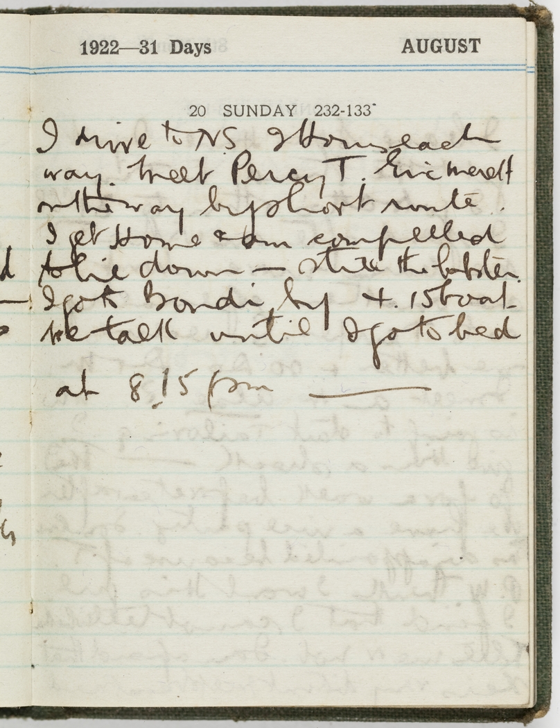 I drive to N.S. 9 hours each way. Meet Percy T., Eric Merett on the way by short route. I get home and am compelled to lie down - still the lobster. I go to Bondi by 4.15 boat. We talk until I go to bed at 8.15 pm.