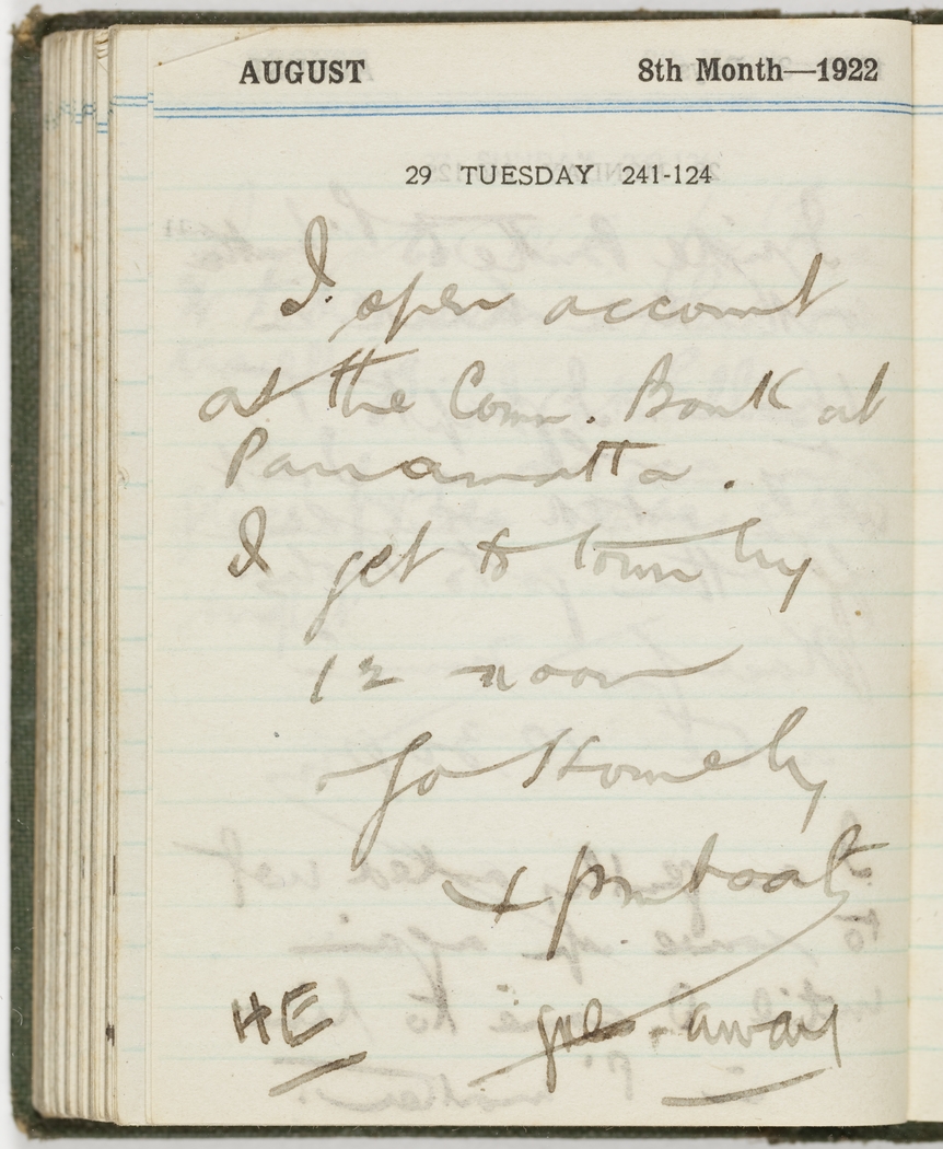 I open account at the Com. Bank at Parramatta. I get to town by12 noon and go home by 4 pm boat. HE goes away.