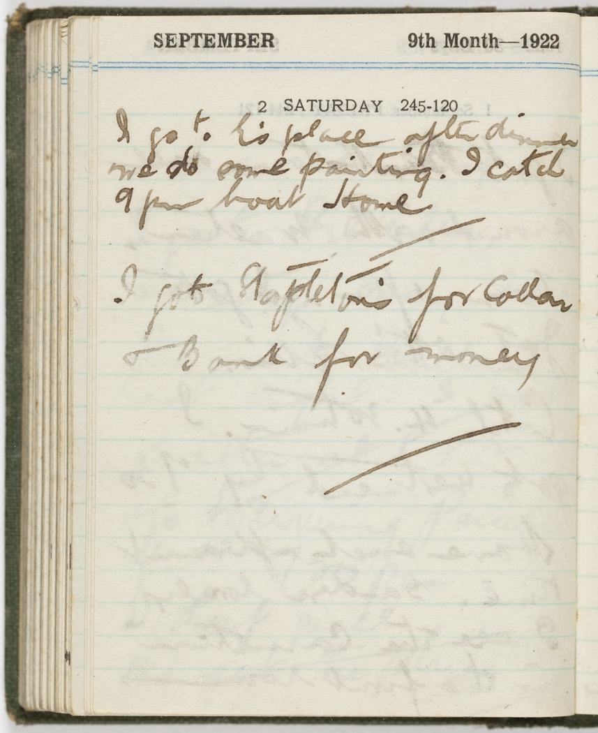 I go to E's place after dinner, we do some painting. I catch 9 pm boat home. I go to Stapleton's for Collar and Bank for money.