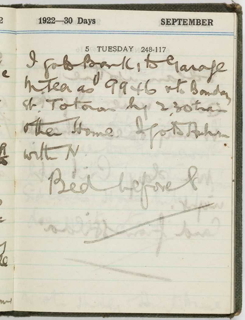 I go to Bank, to Garage, M.Tea as U 9946 and to Banday Street. To town by 2.30 train and then home. I go to Auburn with N. Bed before 8.